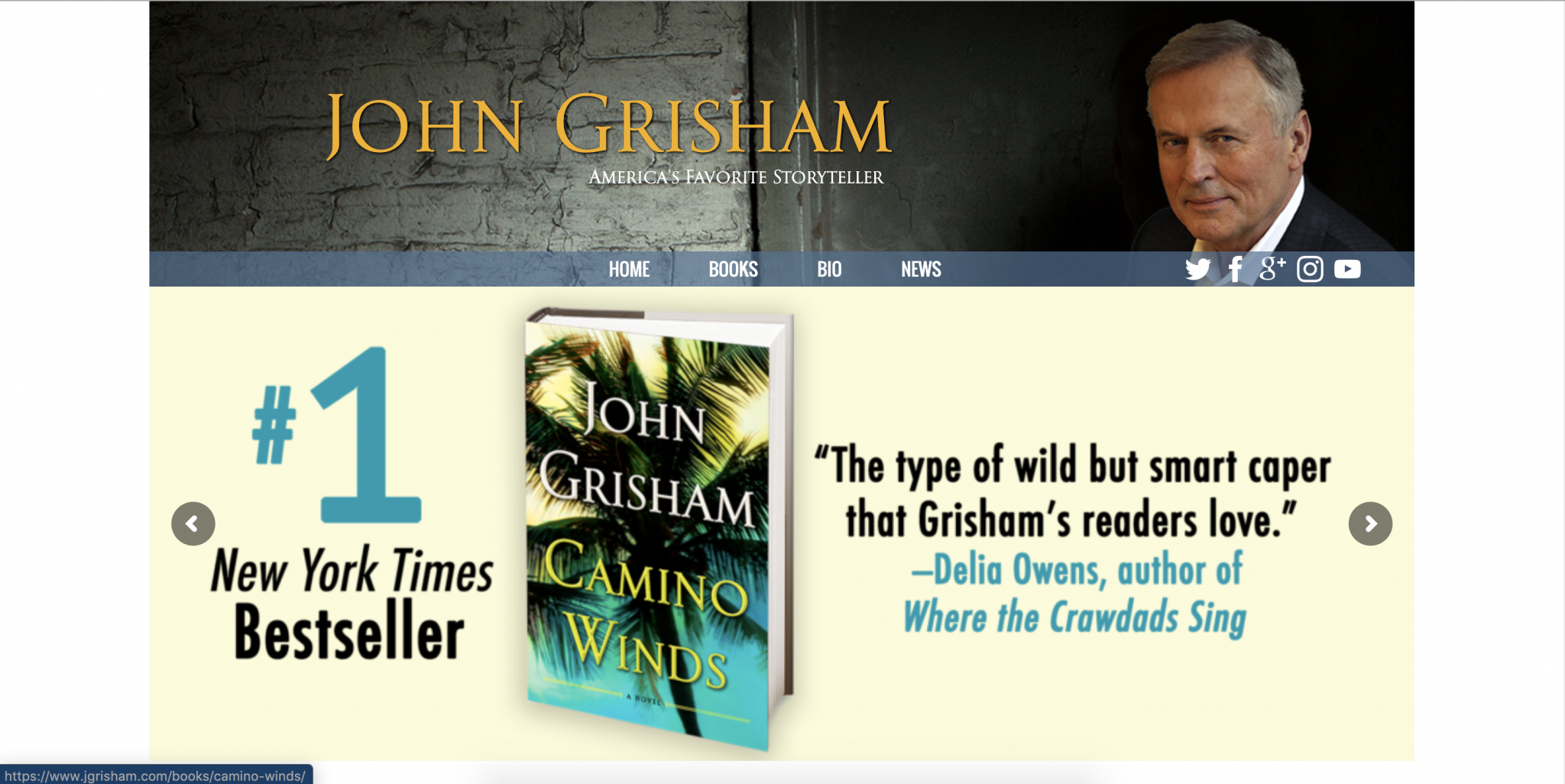 The master of simplicity, Grisham’s site is almost too simple. It actually looks like an out-of-the-box WordPress theme. But his content is on-point consistently. Note again the Hero promoting his newest book. And just below that, we have the columns of content, with email capture prominently displayed.